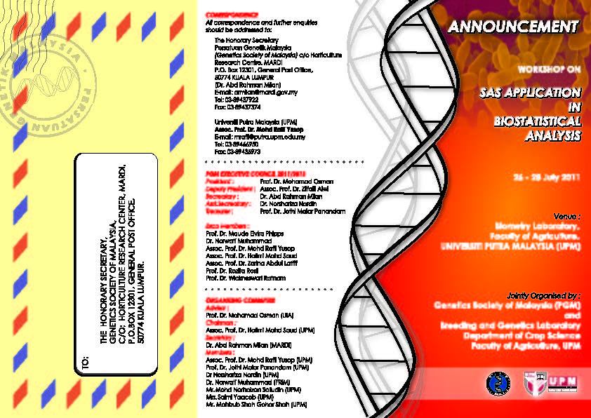 « All Events This event has passed. Workshop on SAS Application in Biostatistical Analysis 26 July 2011 - 28 July 2011 « Gamma GreenHouse (GGH) 9th Malaysia Genetics Congress » + Google Calendar+ Add to iCalendar Details Start: 26 July 2011 End: 28 July 2011 Event Category: PGM Courses Venue Faculty of Agriculture, Universiti Putra Malaysia