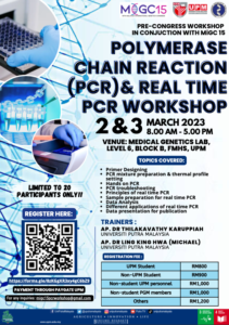 Polymerase Chain Reaction (PCR) & Real Time PCR Workshop Date: 2 & 3 March 2023 Venue: Medical Genetics Lab, Level 6, Block B, FMHS, Universiti Putra Malaysia Download poster : PCR Workshop_PreCongress MiGC15 Topics Covered: Primer Designing PCR mixture preparation & thermal profile setting Hands on PCR PCR troubleshooting Principles of real time PCR Sample preparation for real time PCR Data Analysis Different applications of real time PCR Data presentation for publication Register here: https://docs.google.com/forms/d/e/1FAIpQLSfCH7hkHqLp_50pxQIUWjV2HvThy8BRBMITKYc9oSSJgTuWSg/viewform For any inquiries, please contact AP…