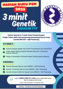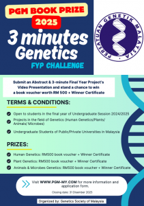The PGM Book Prize is awarded to final year university students who have accomplished outstanding thesis or research work in the field of genetics. The award, which carries with it a cash voucher worth RM500, is established to bring increasing recognition of the scholarly interests and to promote the culture of research among students. Universities will be invited to submit their nominations for the winners of the prize.